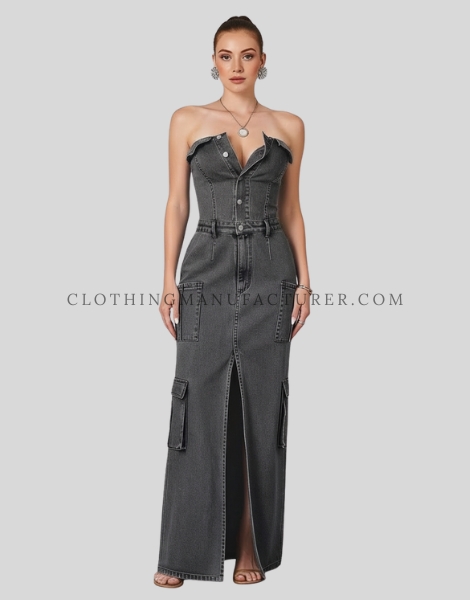 Wholesale Strapless Denim Dress with Multiple Pocket
